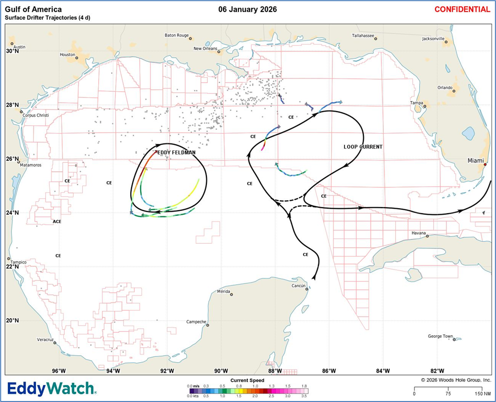 The USV FAST Eddy current monitoring system provides real-time ocean current data that compliments the Woods Hole Group EddyWatch® service. The EddyWatch service was created by Woods Hole Group to support offshore operations in areas of strong current by enhancing operational safety, improving operational efficiency, and minimizing operational downtime. EddyWatch delivers real‑time ocean current intelligence using satellite‑tracked drifting buoys, advanced remote sensing, in-situ data, ocean forecast models, and expert analysis. This allows for clear, actionable reporting and early warning of eddy formation or intensification.